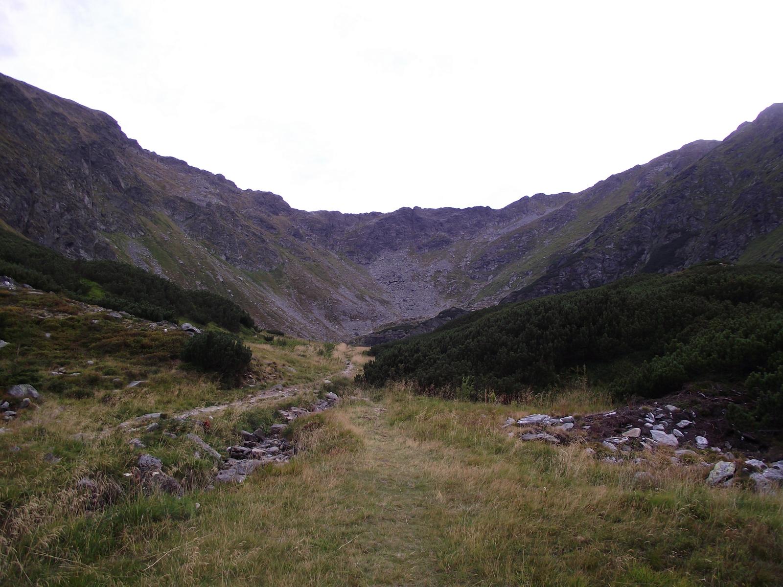 Itt én már tényleg nagyon kivoltam, azt se tudtam, hogyan igazgassam a hátizsákom pántját. Lacát vízhólyag gyötörte, ami visszavett lendületéből, Dóri ellenben simán látótávolságon kívül hagyta a fiúszakaszt - de csak amíg egy kutyaugatás megtorpanásra nem késztette. Ez egyrészt jó jel volt, mert gyanítottuk, hogy a meteorológiai állomáshoz tartozhat az eb, de kicsit tartottunk a kutyákkal való találkozástól, sokat hallottunk már túrázóktól az erdélyi pásztorkutyák csapataival való találkozásokról. Szerencsére csak egyetlen kutya várt ránk az ösvényen, az sem volt akkora, amekkorának a havasi pásztorkutyákat ismertük, békésen kikerültük hát egymást. És megérkeztünk az állomáshoz! A Mosolygó-tó katlanjában jártunk, egy völgyben, amit 2000 feletti csúcsok vesznek körül. A tó egy kicsit feljebb volt, azt még nem láttuk. A házaknál néhány fickóval találkoztunk, megmutatták, hol lehet sátrat verni. A nap éppen lemenőben volt, de még látszott, milyen hihetetlenül szép helyre értünk.