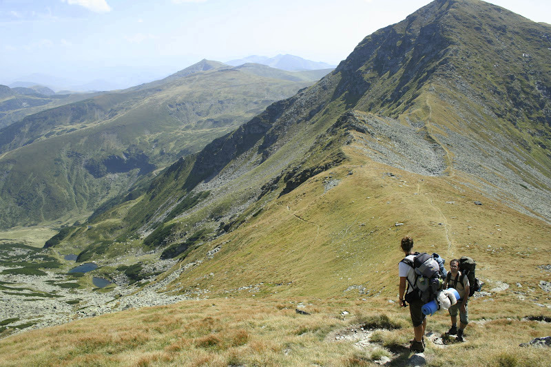 Mi először megmásztuk a Kis-Bukulyt, onnan tekintettük át újra a terepet. A kutyákkal kísért nyáj valóban ott volt előttünk, de két pásztor vigyázta őket, és ahogy megláttak minket közeledni, arrébb is hívták a kutyákat, nem volt gondunk velük. Kicsit néztük a nyájat, a legelőt, és mélyen egyetértettünk Andrissal, amikor azt mondta, "a havasi pásztorok az élet császárai". :) De tényleg: kint vagy a szabadban, békén hagynak az emberek és 4-5 megtermett pásztorkutya engedelmeskedik neked.Innen egy hosszú, viszonylag egyenletes menetelés kezdődött a gerincen. Balra lent volt a Rebra-tó, környékén egy nyájjal, valahol itt lett volna az első