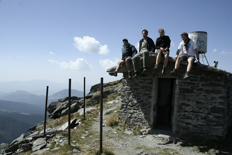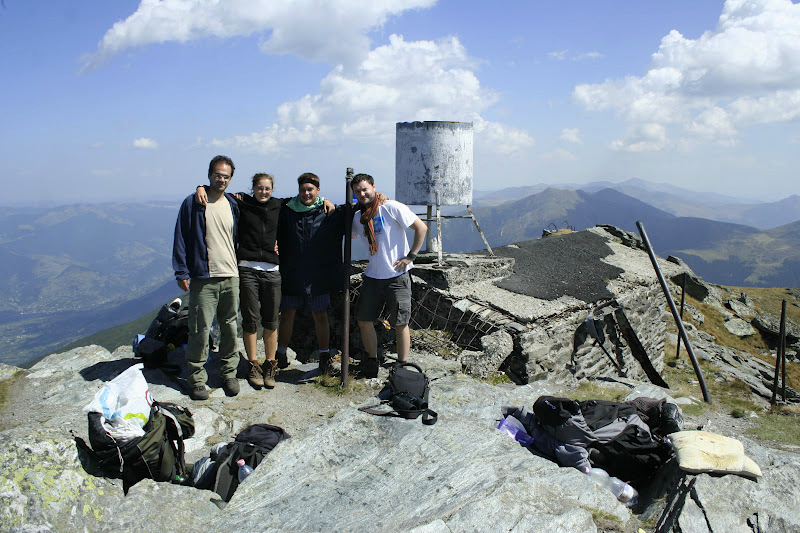 Egy utolsó hosszabb megálló után, némi szőlőcukor és víz felvétele után nekirugaszkodtunk és a nyeregig másztunk. Ott találkoztunk a két román sráccal, akik már a csúcsról jöttek, örömmel üdvözöltük egymást. Innen gyönyörű panoráma látszott, ki is feküdtünk egy időre, élveztük a napsütést, a kilátást, a hűs szellőt. A pihenő után megtettük a végső néhány száz métert és nem túl sok szintet a 2303 méter magas csúcsig. Fent voltunk a Radnai-havasok legmagasabb pontján! Itt megint evés-ivás, fotózkodás, bámészkodás, pihegés következett. Közben jöttek más túrázók is, pl. egy lengyel csapat, akik közt az egyik srác aktívan fényképezte a tájat, és a lehető legalkalmasabbnak bizonyult arra, hogy rólunk csúcsfotókat készítsen. A csúcson volt egy romos házikó (tudtommal itt volt régen a meteorológiai állomás, de lehet, hogy tévedek), ezt is igyekeztünk beépíteni a kompozícióba. :)
