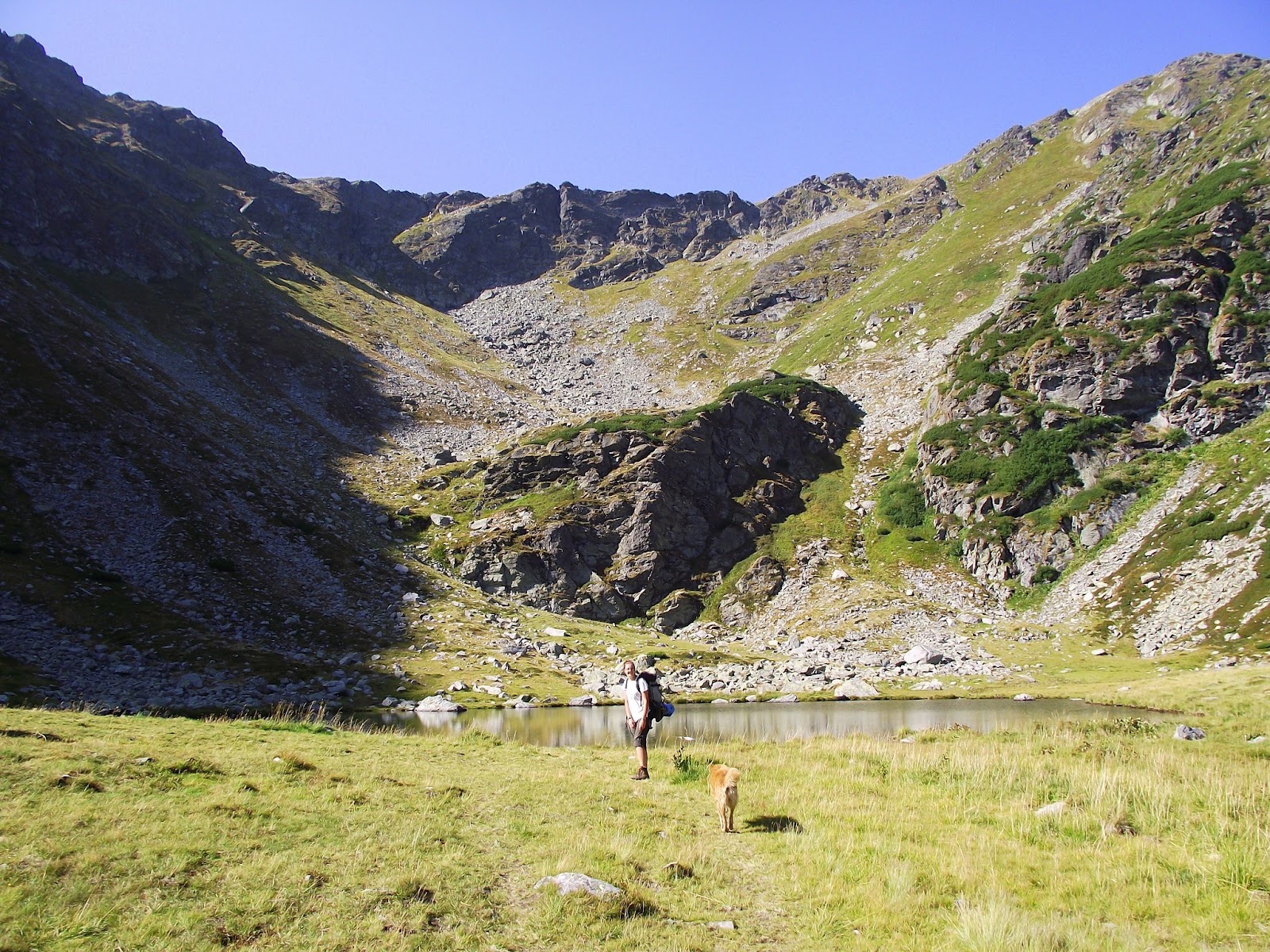 A mai tervünk az volt, hogy pár száz méterrel arrébb, a Mosolygó-tónál megreggelizünk, erőt gyűjtünk, majd nekiugrunk a szerpentinnek, azon fel egészen a Nagy-Pietroszra (Borsától Nagy-Pietroszig az útvonal itt olvasható), s onnan tovább egy távoli sátorozóhelyre. Pakolászás közben hozzánk csapódott egy szép kutya, Dóri egyből össze is haverkodott vele. Kicsit bicegett (mármint a kutya), de teljesen jó fej, nyugis eb volt, még a kajánkból se koldult. Előző éjjel a közelben sátrazott két román srác, akikkel angolul váltottunk pár szót. Jó arcok voltak, ők is a Nagy-Pietrosz felé vették az irányt. Azt mondták, reggel 7 felé akarnak indulni, ehhez képest ők is csak úgy 9 felé támolyogtak elő. Viszont előttünk elindultak, így egy darabig tudtuk őket követni, s álmélkodhatunk azon, hogy merre fogunk mi is menni órákon belül.