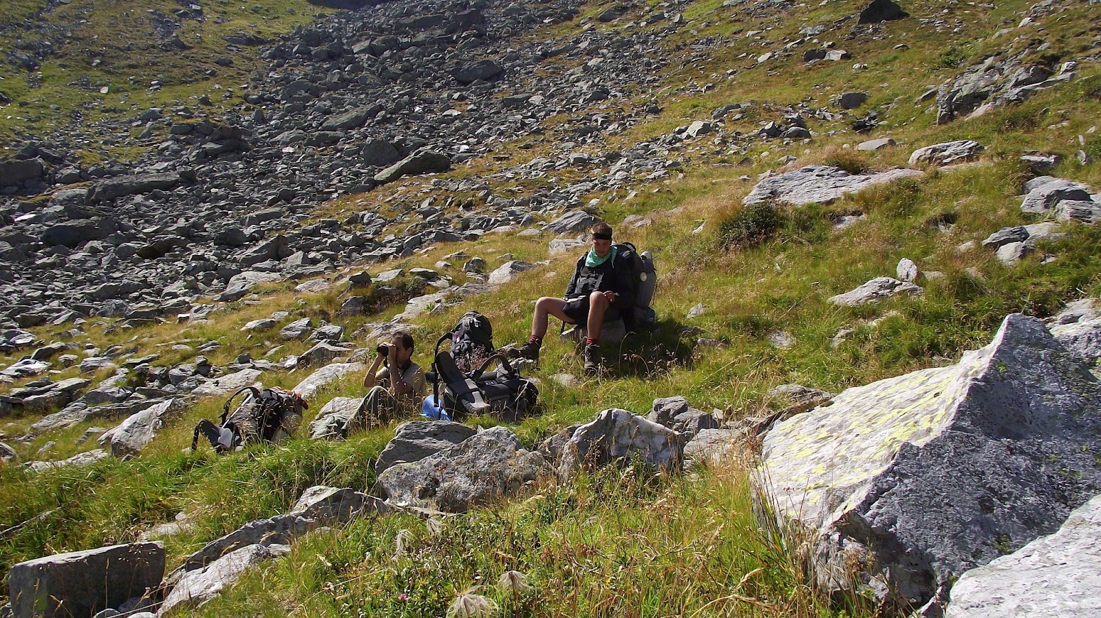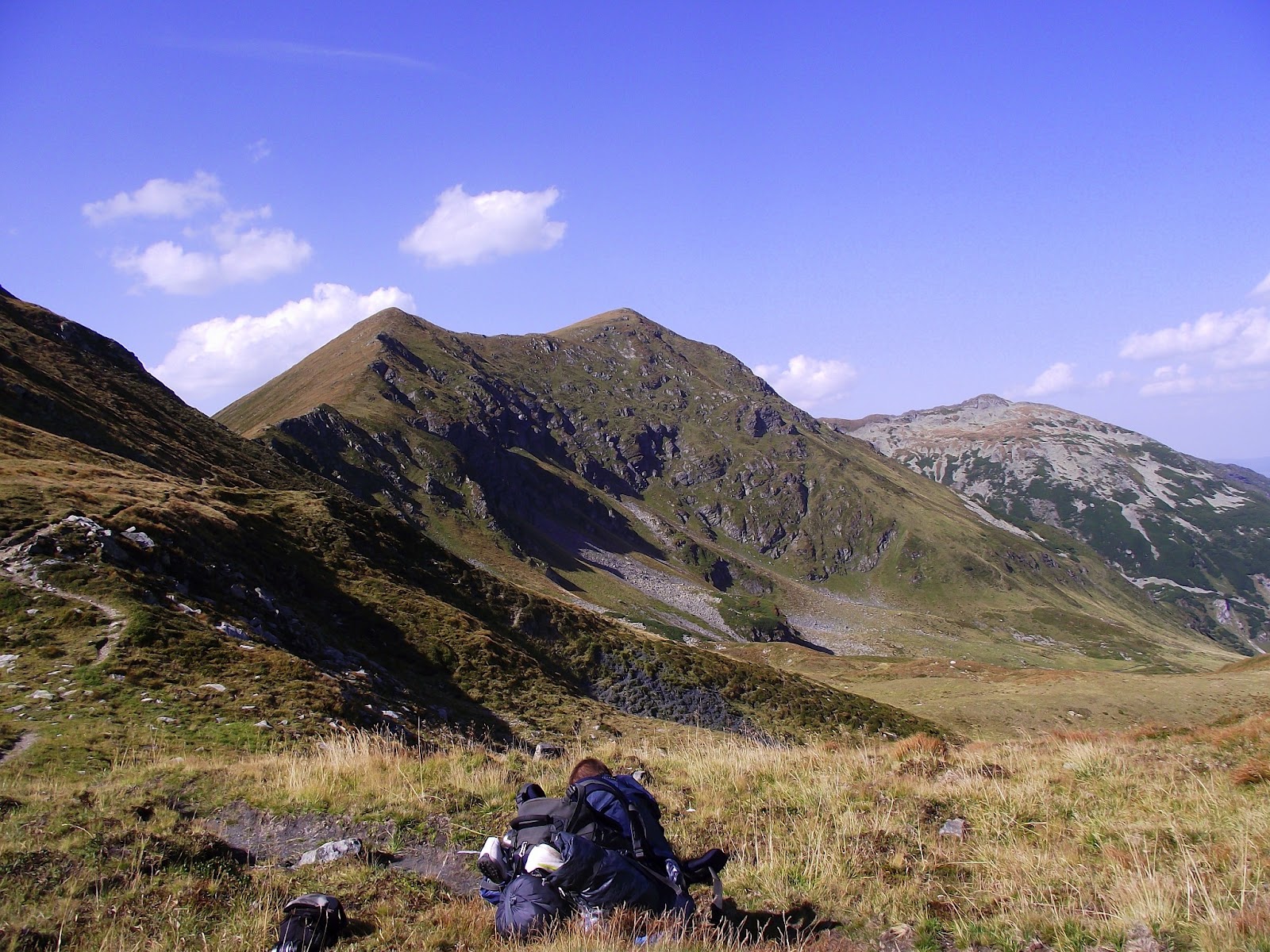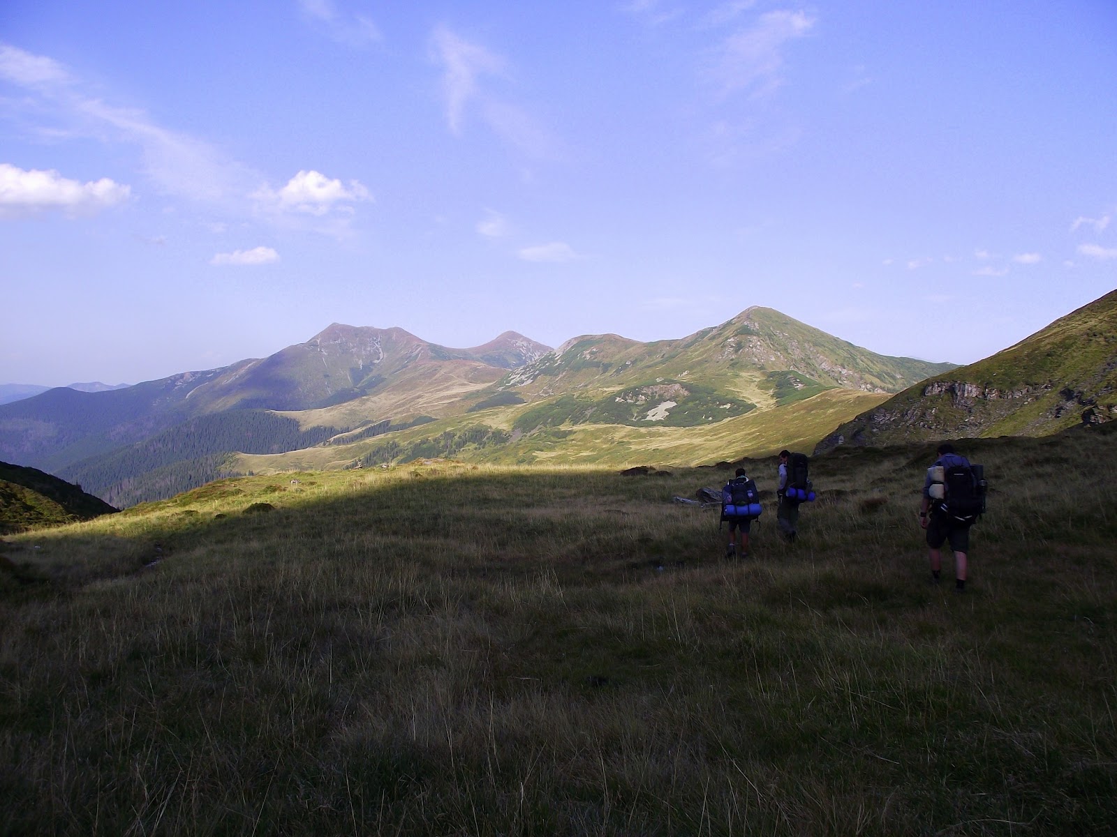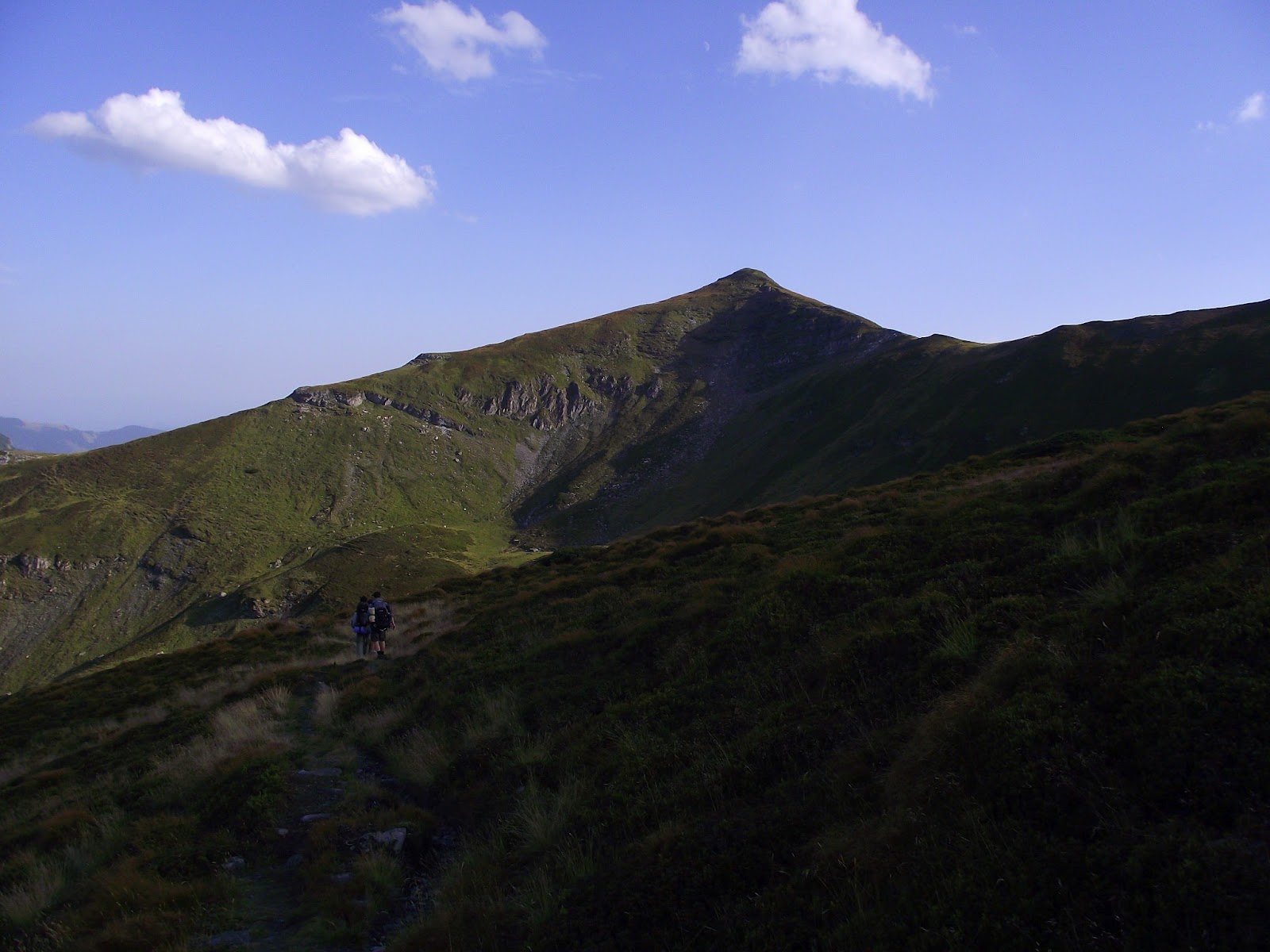 Bukuly-tavakat. A Nagy-Bukulyra megint felfelé kellett kapaszkodnunk. Végül úgy döntöttünk, nem másszuk meg ezt a csúcsot, hanem csak megkerüljük, aztán a Nagy- és a Kis-Bukuly közötti nyeregben újra elgondolkodunk a folytatáson. Itt le is heveredtünk kicsit. Éppen arra jött két magyar turista, akik már hallották hírünket a két román sráctól. Mivel ők éppen szemben jöttek szinte ugyanezen az útvonalon, ki tudtuk őket faggatni a folytatásról, köztük olyan fontos kérdésekről, mint sátorozóhelyek, források, pásztorkutyák helyzete. Ők mondták, hogy inkább a távolabbi sátorozóhelyben gondolkodjunk, mert a közelebbi egy kabana (menedékkunyhó, a pásztorok használják, a nyáj is a közelben szokott lenni) mellett van. Források többnyire rendben, viszont a Kis-Bukuly után lesz egy nyáj 4 kutyával. Vettük az adást, ők meg mentek tovább.