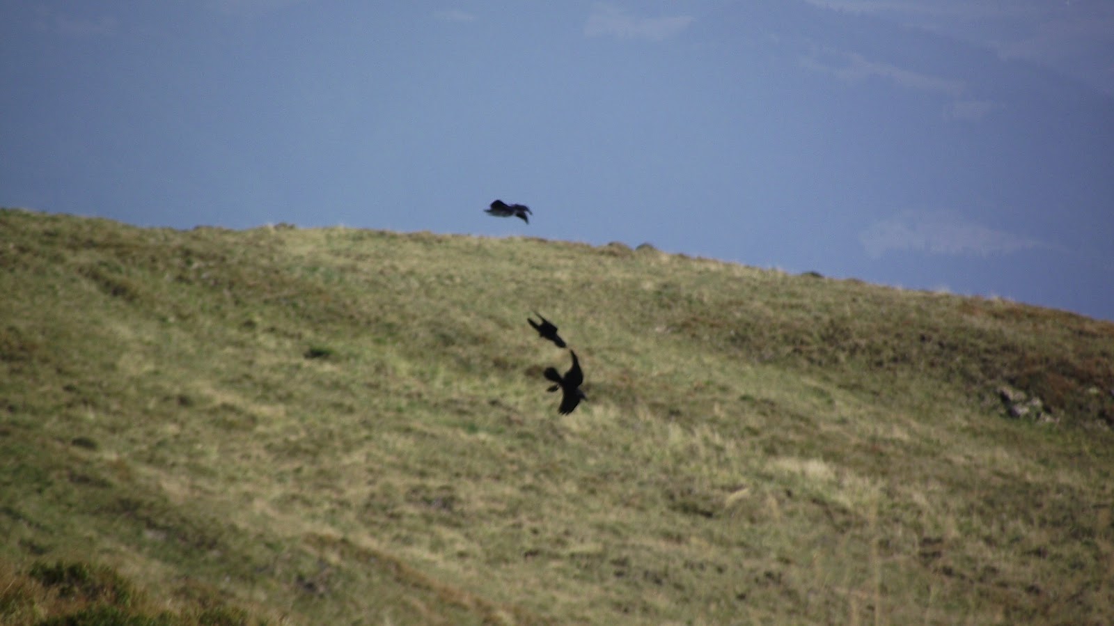 Elég sok túrázó jött szemben, a köszönésekből pedig rájöttünk, hogy valószínűleg a többség cseh. Az Obarsia-Rebri csúcs aljában kicsit pihentünk. Néztük a hollókat, ahogy akrobatikus mutatványokat hajtottak végre a levegőben. Ahogy jobban odafigyeltünk, mit csinálnak, világossá vált, hogy tehénlepényeket vittek fel magukkal a levegőbe, elengedték, majd újra elkapták őket!