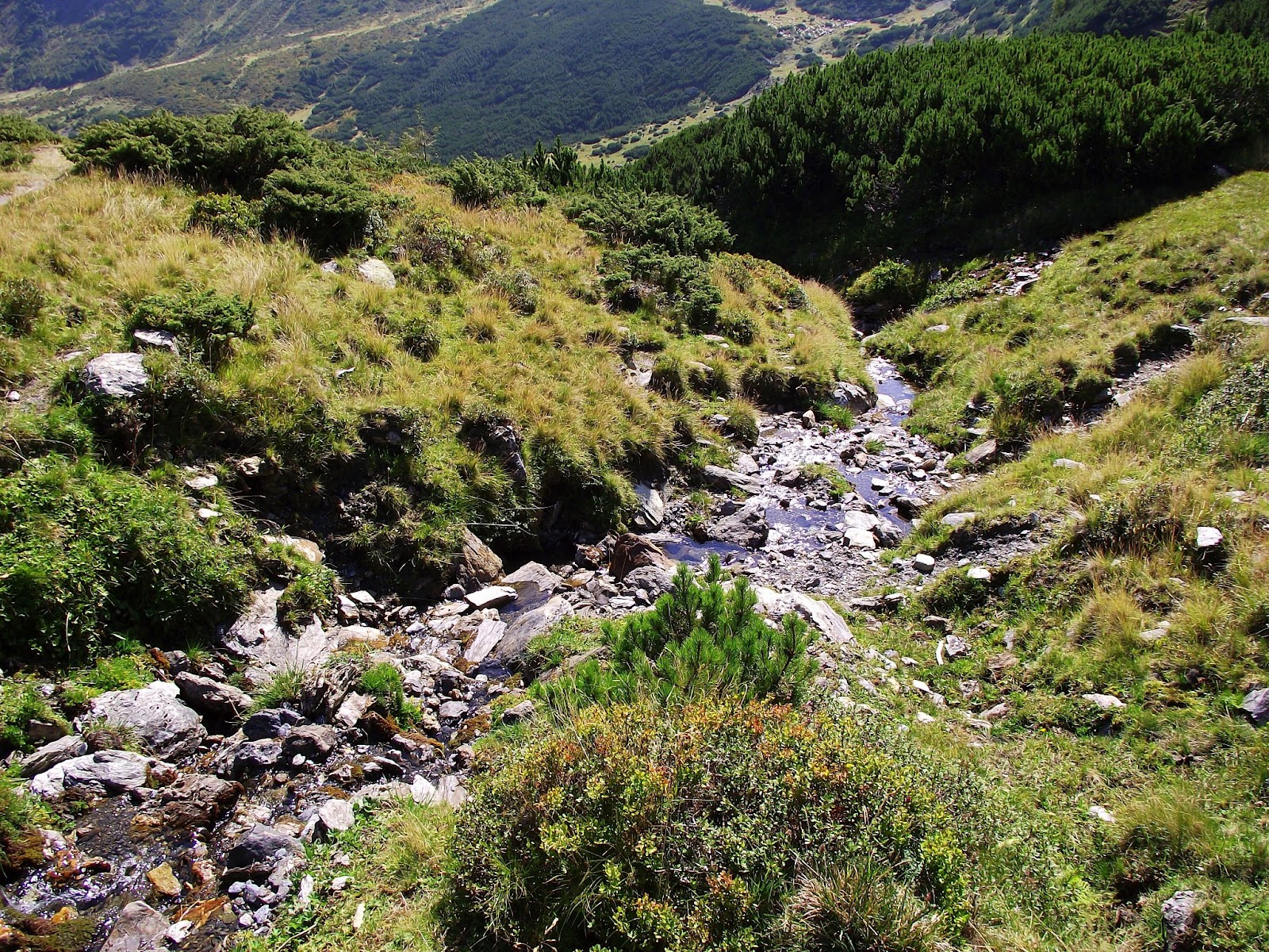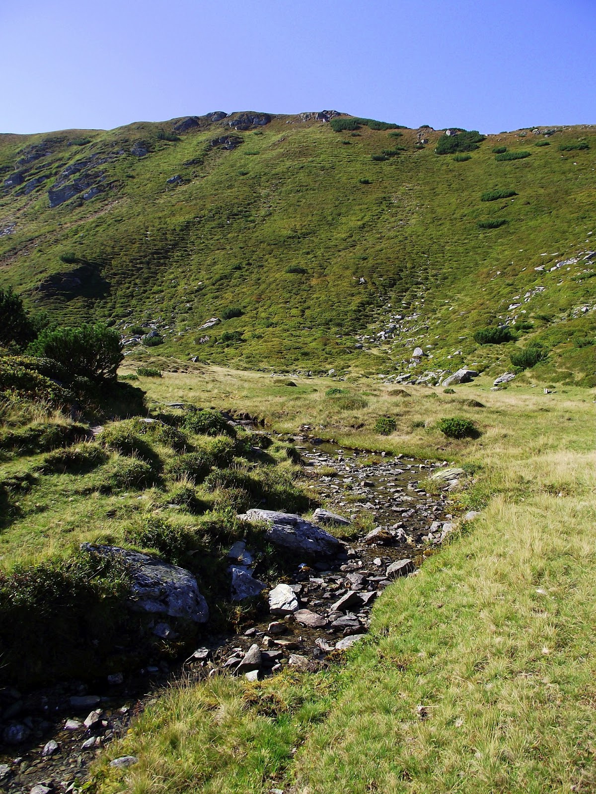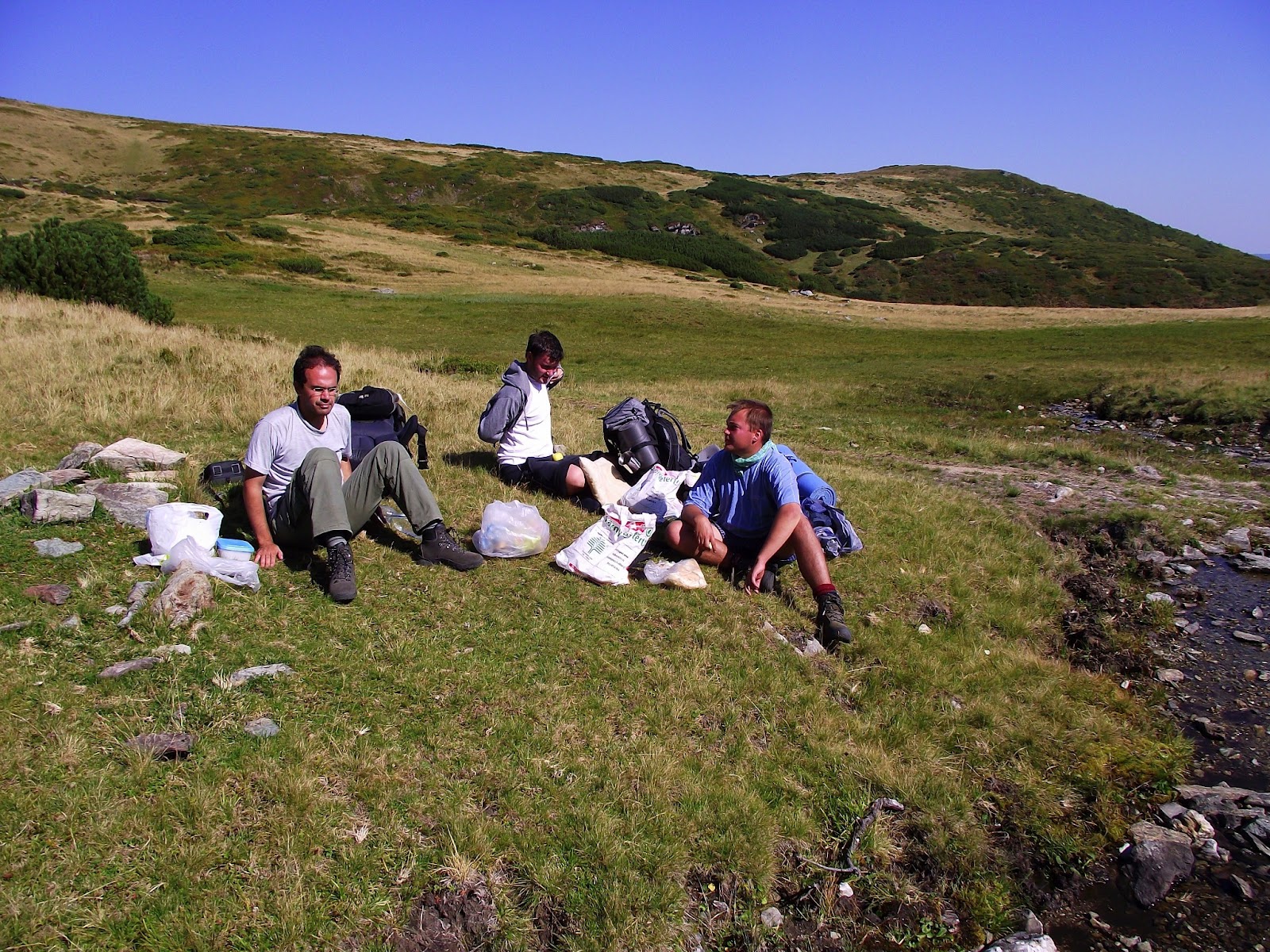 Ez az utolsó napunk a hegyekben, nem is lehet más a tervünk, mint a lejutás, amely ereszkedéssel jár elkerülhetetlenül. A Gargaló-nyergen át a Lóhavasi-vízesés érintésével szerettünk volna Borsafüredre érkezni. A táborhelytől először még emelkedtünk, hogy kimásszunk a katlanból. A Ló-havas oldalában a térkép kis tavacskákat jelöl, de vizet mi nem láttunk, csak kiszáradt medreket. Közben megérkeztek a nyájak, kettő mellett is elhaladtunk. Biztonságos távolból megcsodáltuk a bárányokat és a kutyákat, majd intettünk a pásztoroknak is egyet. Innen nem volt messze az utolsó magaslat, a Gargaló-nyereg, ahol kvázi-csúcsfotót készítettünk. A gerincet keresztezve északi irányban ereszkedtünk keveset a hegyoldalban, majd egy patak partján, (szokás szerint) festői környezetben elköltöttük utolsó reggelinket. Borsafüred felé ereszkedtünk tovább a kék jelzésen. Előbb törpefenyvesben haladtunk, majd legelők mellett vezetett utunk. A képek magukért beszélnek...